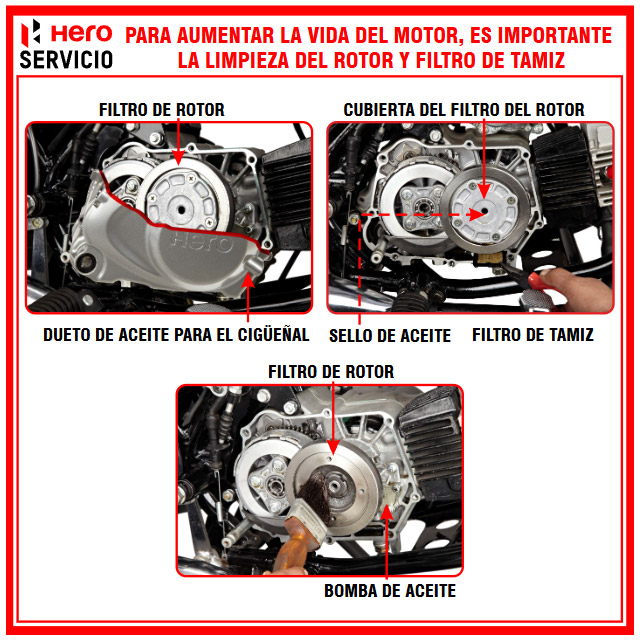 Llegar al filtro centrífugo implica drenar el aceite y destapar el cárter derecho del motor. Por esta razón, se recomienda acudir siempre a un Taller de Servicio Autorizado Hero.